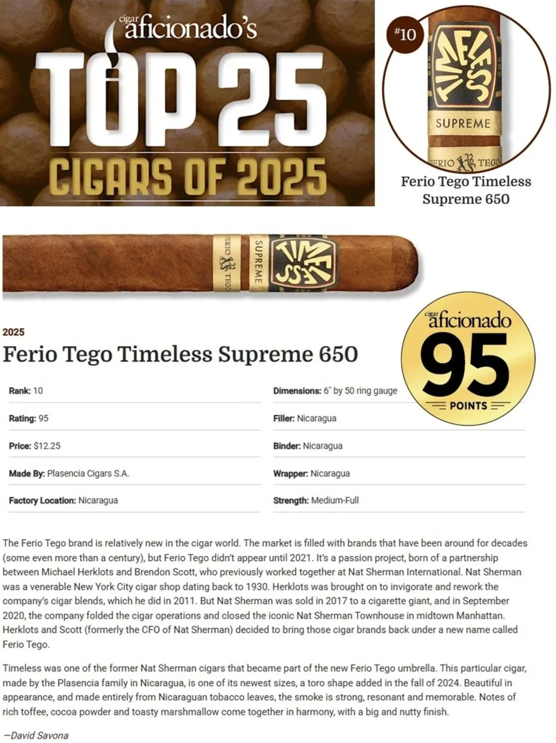 #10 Cigar of the Year by Cigar Aficionado| Ferio Tego Timeless Supreme Dec 15 Written By michael herklots Cigar Aficionado’s Annual Top 25 Cigars list is out, and the Ferio Tego Timeless Supreme took the number ten spot scoring 95 Points! michael herklots https://feriotego.com